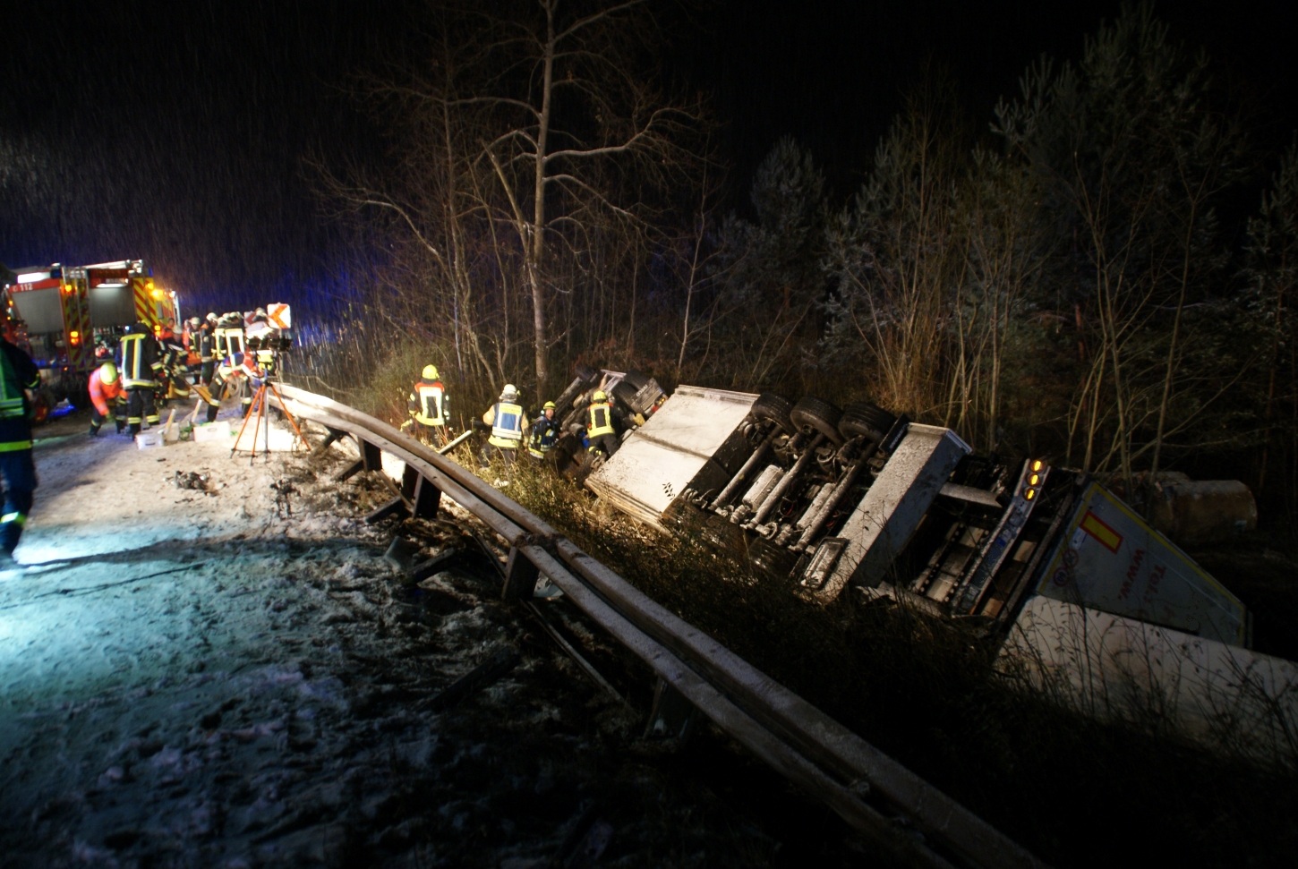 Mit dem Alarmstichwort „Verkehrsunfall LKW/Bus (leer), Person eingeklemmt“ wurden wir in der Sonntagnacht auf die BAB 9 zwischen Hormersdorf und Schnaittach alarmiert. Aus bislang unbekannten Gründen kam ein LKW von der Fahrbahn ab, durchbrach die Leitplanke und stürzte eine Böschung hinunter.