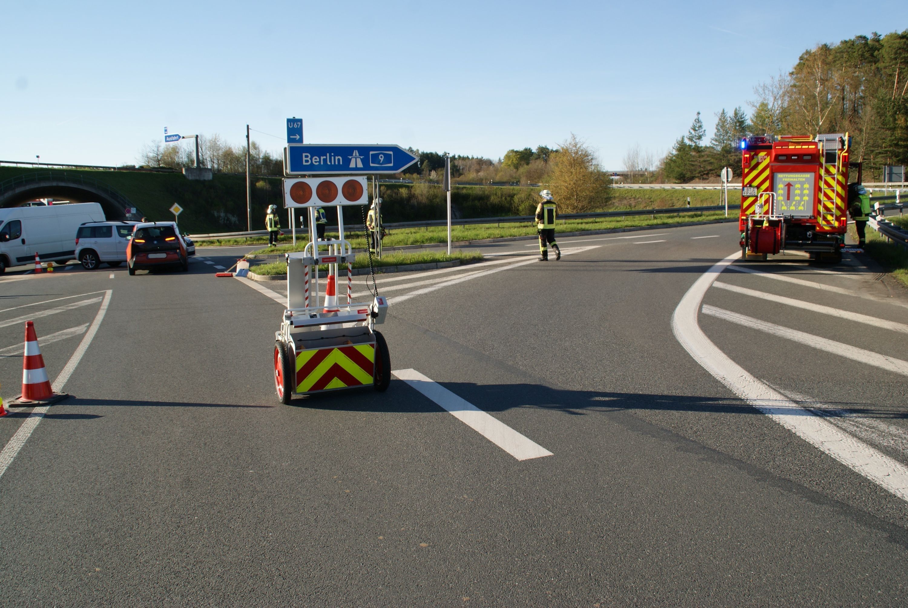 Donnerstagbend wurden wir zu einem Verkehrsunfall an die BAB 9, Anschlussstelle Plech, alarmiert. Im Kreuzungsbereich zur Autobahn kam es zu einem Zusammenstoß zweier PKW.