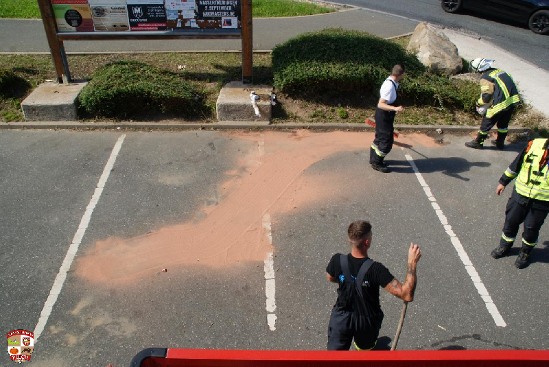 Ein LKW hat Kraftstoff auf dem Parkplatz verloren und dieser drohte in die Kanalisation zu laufen. Wir sperrten den betroffenen Bereich ab und banden den Betriebsstoff mittels Ölbinder.