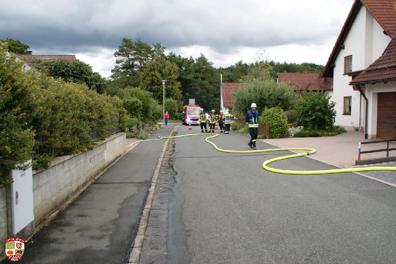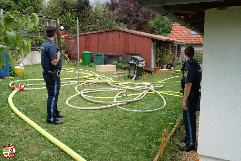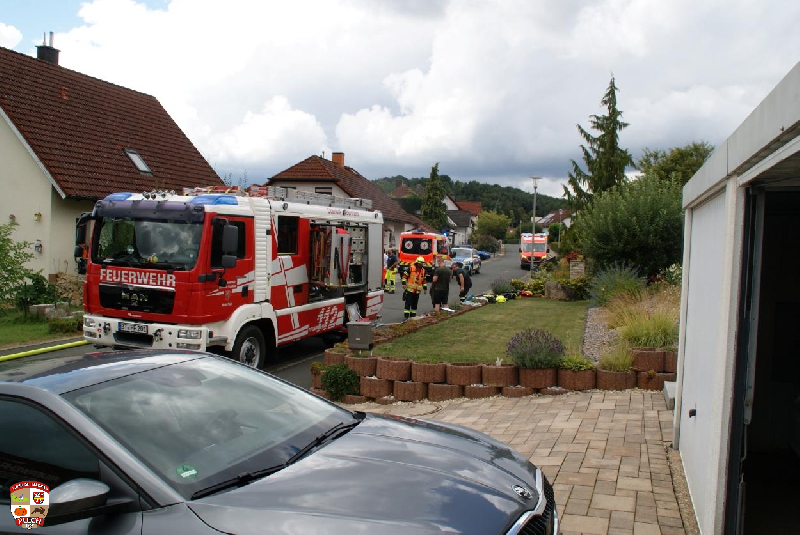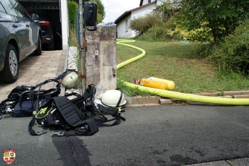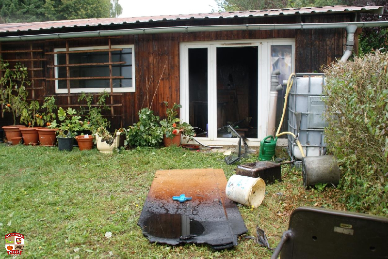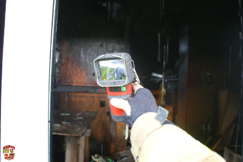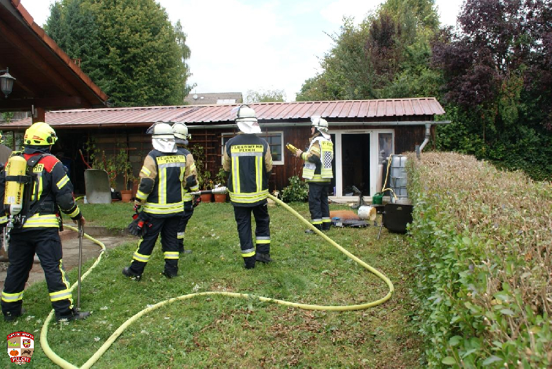 Am Einsatzort wurde sofort die erste Wasserversorgung über einen Oberflurhydranten sicher gestellt und der Atemschutztrupp durch das Aufbauen des Löschangriffes bis zum Verteiler unterstützt. Bei dickem Qualm und absoluter Nullsicht kämpfte sich der Angriffstrupp durch die Gartenhütte und konnte nach kurzer Zeit das Feuer finden und ablöschen. Es wurde eine Gasflasche und mehrere Campingkartuschen nach draußen gebracht und in einer Regentonne abgekühlt.Im weiteren Verlauf wurde die Decke entfernt und Glutnester abgelöscht.