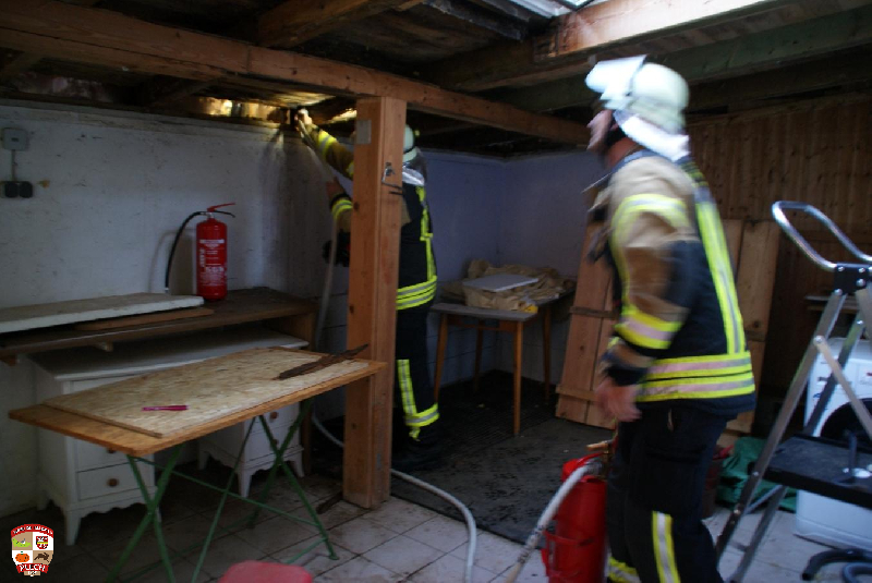 Auf der Anfahrt rüstete sich ein Atemschutztrupp mit schwerem Atemschutz und ein weiterer beim Eintreffen an der Einsatzstelle aus. Am Einsatzort war ein Anbau leicht verraucht und starker Brandgerucht war bemerktbar. Mithilfe des Lüfters von Ottenhof-Bernheck lüfteten den Raum und kontrollieren den Dachbereich mit der Wärmebildkamera. Da der Hausbesitzer bereits selbst Löschmaßnahmen unternommen hatte, kühlten wir den betroffenen Bereich mit der Kübelspritze.